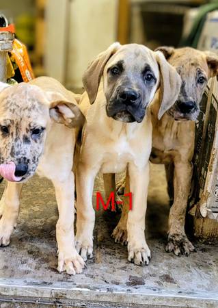 Large Daniff pups for rehome. ONLY 2 Males Left ! Fully vaccinated 11 weeks old . Reasonable Rehoming Fee!! Please leave name and number if interested, serious inquiries only.