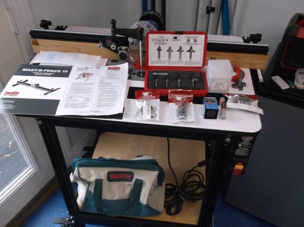 Jessem Rout-R-Lift 11 Table package with Jessem caster wheels used less than 5 times. Like new condition. Includes 3 insert rings, Mast-R-fence 111, Mast-R=Top, Steel router table stand & Clear cut stock guides. Option to buy Bosch router with Bosch bag and over $500 in bits most are new never used, most are whiteside. Comes with all manuals.